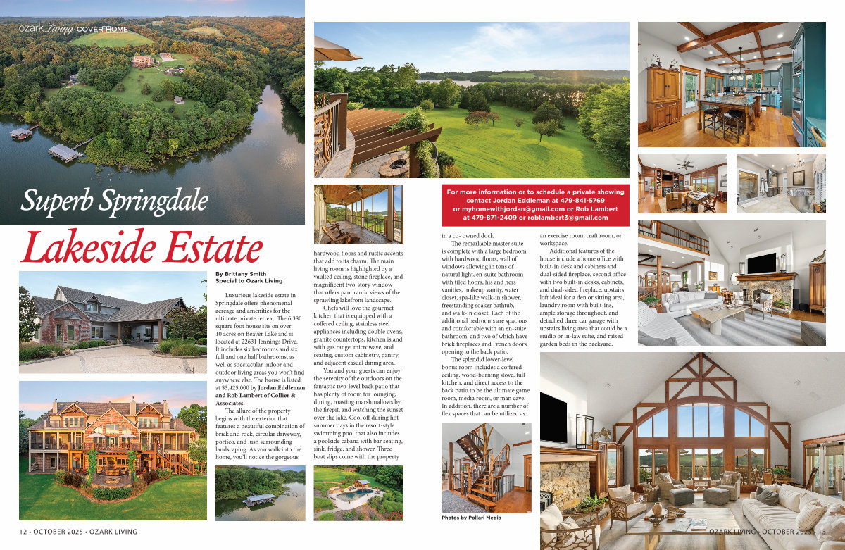 Luxurious lakeside estate in Springdale offers phenomenal acreage and amenities for the ultimate private retreat. The 6,380 square foot house sits on over 10 acres on Beaver Lake and is located at 22631 Jennings Drive. It includes six bedrooms and six full and one half bathrooms, as well as spectacular indoor and outdoor living areas you won’ t find anywhere else. The house is listed at $ 3,425,000 by Jordan Eddleman and Rob Lambert of Collier & Associates.